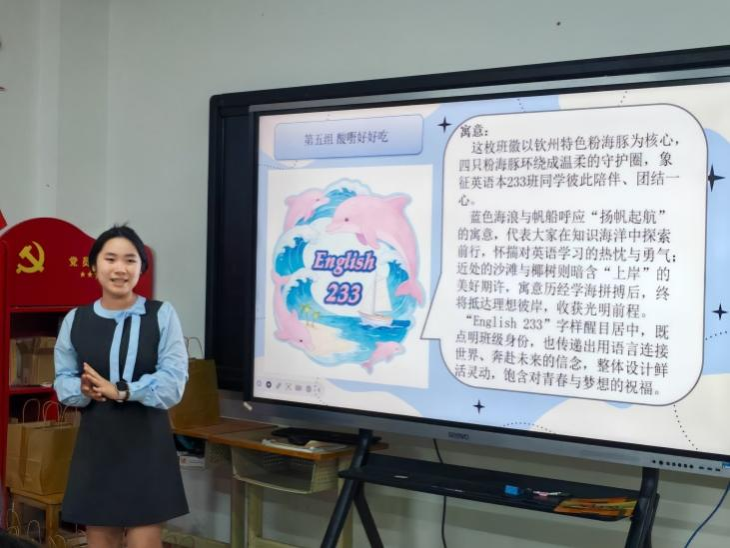 活动伊始,主持人宣布活动开始并介绍到场嘉宾,班级风采回顾视频温情播放,营造出温馨氛围。团支书总结班级建设成果,强调班徽作为班级文化符号的重要意义,鼓励同学们凝聚集体智慧、彰显班级风采。本次活动自3月14日启动,同学们以5-6人为一组,紧扣英语专业特色与班级精神创作,共征集到12份原创班徽作品。评选环节中,各小组代表上台展示作品、阐述设计理念,每一份作品都凝聚着成员的巧思与对班级的热爱。