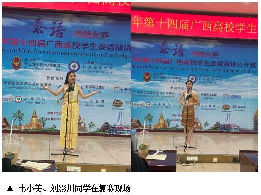 复赛环节要求选手以“新冠疫情下的中泰关系”为题进行5分钟的主题演讲,在该环节的比赛中我院泰语本181班韦小美、泰语本191班刘影川分别以第五、第六名的成绩进入了决赛。