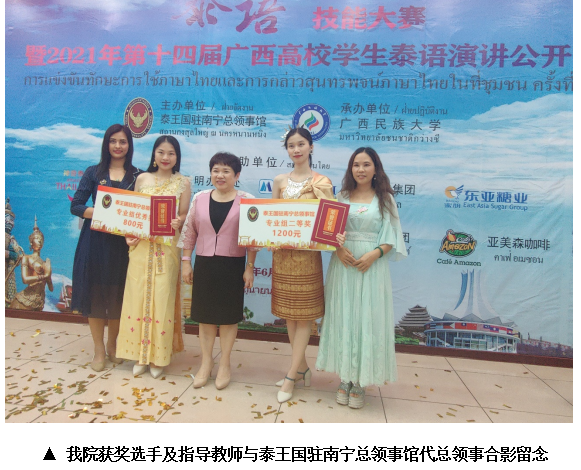 为了迎接本次比赛,参赛选手在党雪妮老师和泰国外教魏彩萍老师的指导下,历经一个多月的艰苦训练,牺牲了很多休息时间进行强化练习和最后冲刺!我校于2018年开始招收泰语专业本科生,一分耕耘一份收获,此次比赛,我院两名选手在激烈的专业比赛中脱颖而出,均斩获奖项,实属不易。此次获奖是对我校泰语专业办学质量的肯定,给了我校泰语专业师生极大的鼓舞。今后,我院将继续努力,争取将泰语专业越办越好!
