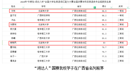 近日,第四届“外教社·词达人杯”全国大学生英语词汇能力大赛全国决赛落下帷幕,我校学子在本科非英语类专业组中荣获一等奖1项、二等奖1项、三等奖1项,其中刘布同学获得广西壮族自治区第1名的好成绩。