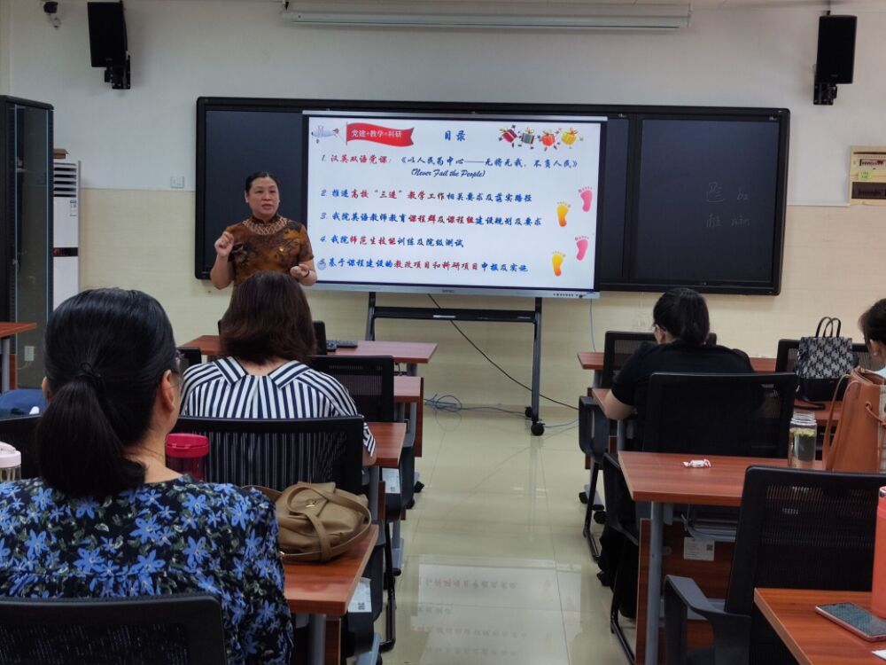 潘景丽同志首先强调了“团队及团队力量”,通过寓言故事与文献典故阐述了个人与团体不可分割的紧密联系,号召团队成员牢记团队精神,实现个人价值与团队绩效双赢。然后,面对多元化、国际化的需求,潘景丽同志利用专业优势,上了一节汉英双语党课:《以人民为中心——我将无我,不负人民》(Never Fail the People),通过解读《习近平谈治国理政》中英文版本原著文本、分析案例等方式阐述了习近平总书记“以人民为中心”治国理政理念及其在中国的实践,使党员教师们更好地理解了习近平总书记“我将无我,不负人民”的人民情怀,并号召教师们践行习近平总书记的“以人民为中心”的理念,落实立德树人根本任务。随后,潘景丽同志阐释了我国推进高校“三进”教学工作相关要求及我校推进情况,特别阐述了如何通过课程建设推进高校“三进”教学工作的情况。之后,结合我院教师教育团队建设与师范生培养等工作,通过与教师分享其个人建设课程、参与教学比赛、申报教改及科研项目等经历,阐述了实施“党建+教学+科研”一体化的路径,鼓励教师提升政治站位,将个人发展与国家需求结合起来,推进“党建、教学、科研”工作协同发展。