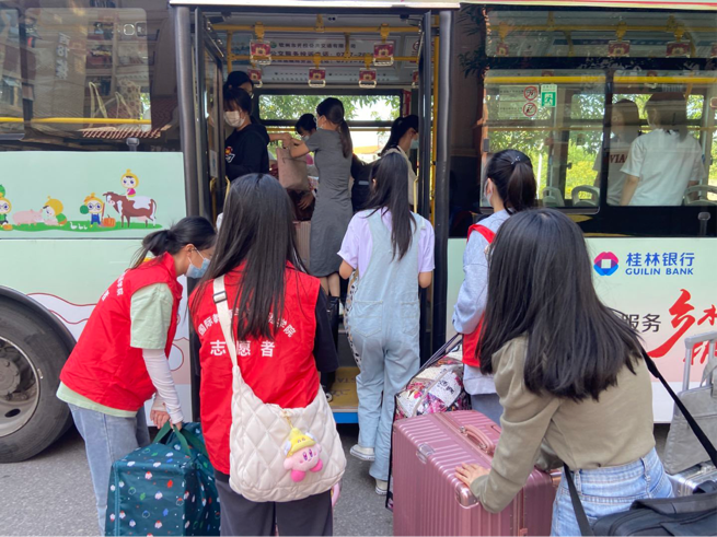 我院37名党团员志愿者早早在西16栋、西17栋楼下等候,他们热情地帮助外出实习的毕业生将行李搬运到宿舍楼下,再帮忙搬运到候车点。