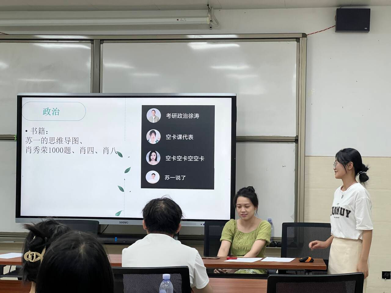 会议由经验分享和交流问答两部分组成。首先,罗智丹学姐谈了她选择考研的原因,一是为了提升学历,二是为了就业。接着,她分享了自己的备考过程,从时间分配到内容安排,再到资料推荐、复试经验,十分详细,同学们听得也格外认真。李凯丽学姐则从另一角度分享了她的考研经验。她告诉同学们要注意考研的重要时间节点,了解相关流程。接着,她分学科推荐了相关的考研书籍、网课,大致讲解了考试题型。郭泽川学长则从调整备考状态这一方面切入。他提到在备考过程中要注意适当放松,防止后期乏力。在交流问答环节中,同学们踊跃提问,学长学姐们进一步分享了备考历程,同学们收获满满。
