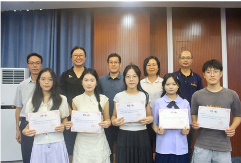 随后,毕业生代表覃双梅分享了学习、就业方面的心得以及对学院建设的建议。之后,教师代表罗梅老师发言,她讲述了自身的工作经历,勉励毕业生认真工作、积极生活。接着,非毕业生代表谢修兰发言,她衷心祝愿学长学姐们生活遂意。在互动交流环节,毕业生和参会的领导、老师热烈交流未来的人生规划。会议的最后,我院为7名校友联络大使颁发了聘书,为未来的校友工作奠定了良好基础。会议结束后,同学们领取了学院给全体毕业生准备的纪念品。全体参会人员在学院大厅门口合影留念。