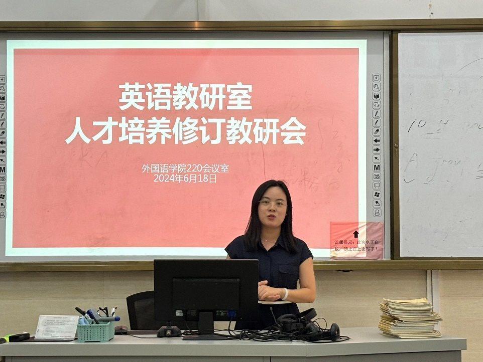 为加快建设海洋特色鲜明的高水平应用型大学,构建高水平应用型人才培养体系,提升2024版英语专业人才培养方案修订质量,促进学院教育教学和专业建设高质量发展,6月18日下午,《英语专业本科人才培养方案》修订教研会在外国语学院220教室召开,外国语学院主管教学副院长蔡成龙,英语教研室全体教师参加。此次教研会由英语教研室主任蒙松子主持。