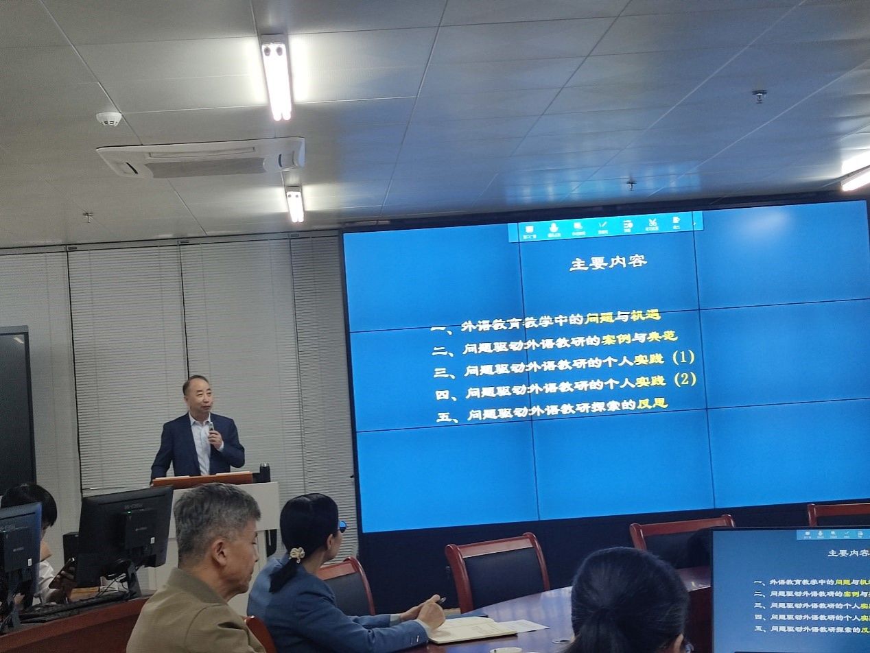 讲座中,常俊跃教授结合自身多年的外语教育研究与改革实践,系统阐述了“现实问题驱动”在外语教育教学研究中的重要意义。他强调了从教学实际中发现问题、思考问题并寻求解决方案,是促进教师专业成长、推动外语教育高质量发展的关键路径。常教授通过丰富的研究案例,展示了如何从日常教学实践中提炼研究课题,以及如何通过问题导向的研究推动课程改革、师资发展与人才培养,为在座教师提供了清晰而务实的研究思路与方法借鉴。