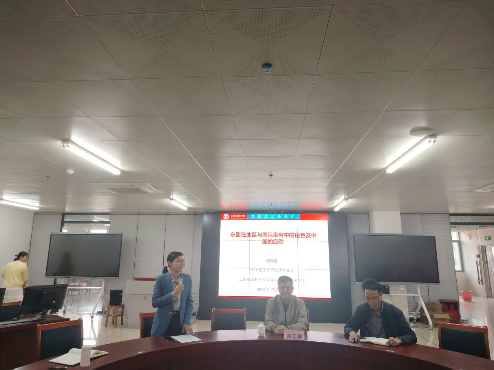 2025年12月22日下午,为积极推进学院新近启动的区域与国别学研究所建设,拓展研究视野、夯实学科基础,学院特邀上海社会科学院国际问题研究所研究员胡志勇教授,为全院教职工作了题为《东盟在地区与国际事务中的角色及中国的应对》的专题学术讲座。讲座由学院黎茂昌副院长(主持工作)主持。