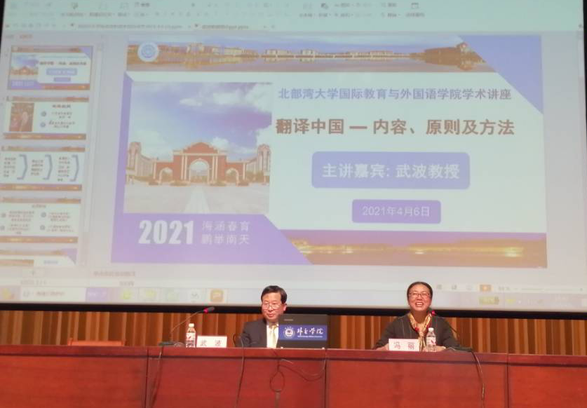 202146日下午外交学院武波教授为我院全体师生作了题为翻译中国—内容、原则及方法”、“中国古典文化与英语课堂思政教育两场学术讲座。讲座由我院冯丽院长主持。出席学术讲座现场的领导有北部湾大学党委副书记陈锦山国外院全体领导班子