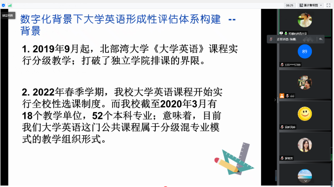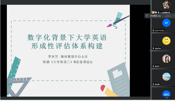 2022年3月28日下午,国际教育与外国语学院全体教师线上进行了2022年春季学期第二期教师沙龙,题目为“数字化背景下大学英语形成性评估体系构建”。本期沙龙由学院语言实验教学中心主任罗英芳和《大学英语二》B班备课组长陈娜两位教师主讲,大学外语教学部主任郭杏主持。