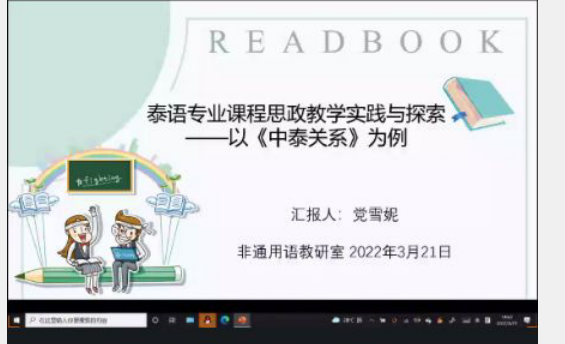 2022年3月21日下午,我院2022年春季学期第一期教师沙龙在线上进行,非通用语教研室主任党雪妮以“泰语专业课程思政教学实践与探索——以《中泰关系》为例”对我院泰语专业课程思政教学实践工作做了汇报。我院全体教师参加了本次教师沙龙活动。