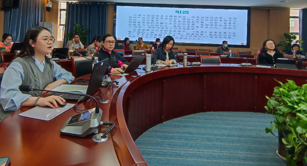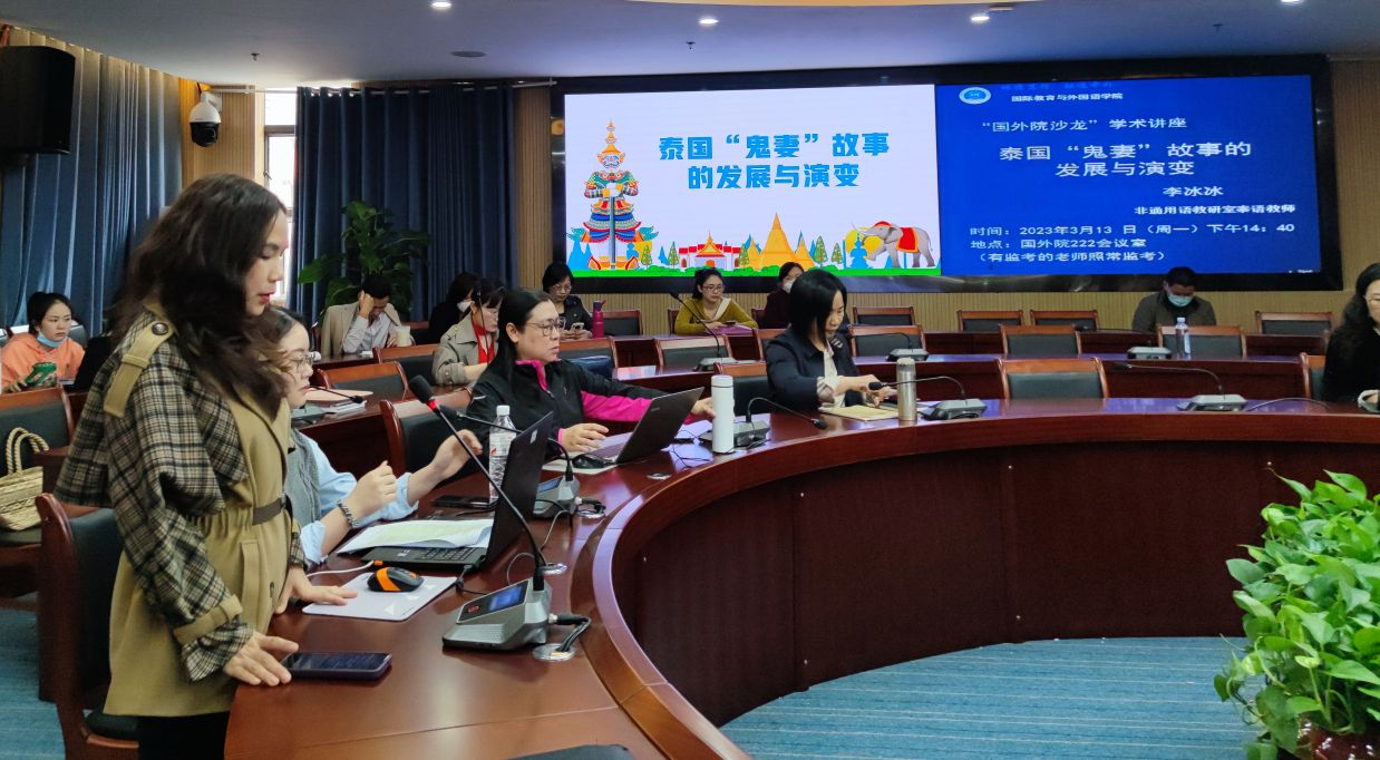 2023年3月13日下午,我院2023年春季学期第一期“国外院沙龙”由非通用语教研室泰语教师李冰冰作了题为“泰国“鬼妻”故事的发展与演变”的讲座。讲座由我院非通用语教研室主任党雪妮主持,我院全体教师聆听讲座。