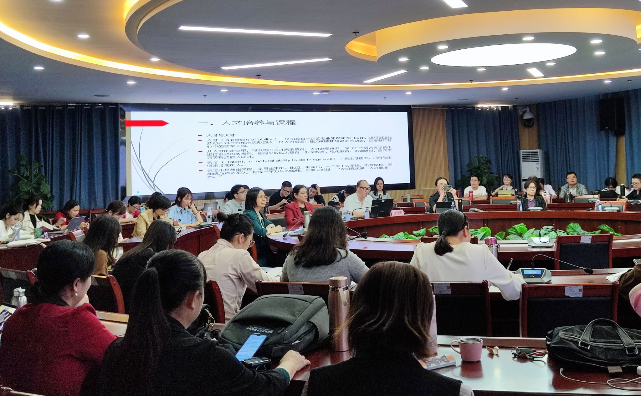 人才培养的意义、课程建设的内涵、专业课程建设等各方面进行了分析,引出了英语课程的建设需要以人才需求为导向,以课程架构为依托,以实际学情需求为抓手,以及以学习环境条件为保障。吴教授就英语专业师资队伍建设中突出的问题,如学历或职称有待提高,交流研讨机会少,科研项目数量和质量,高质量教学成果奖少等问题列举出来,针对以上问题的解决吴教授还拟出整改措施。