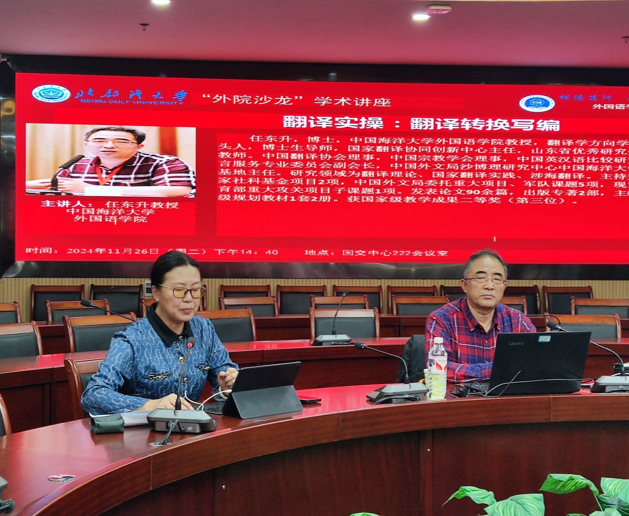 为了激发我院的学术活力,拓宽师生的知识视野,并营造更为浓厚的科研氛围,2024年11月26日下午,外国语学院邀请中国海洋大学任东升教授为师生们带来了一场题为“翻译实操:翻译转换写编”的精彩学术讲座。本次讲座在国际交流中心222会议室进行,由冯丽院长主持,学院全体教师出席并聆听了讲座。