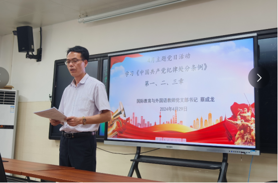 2024年4月29日,国际教育与外国语学院教师党支部在党员活动室217开展“学习《中国共产党纪律处分条例》”主题党日活动,全体党员同志集体学习《中国共产党纪律处分条例》第一、二、三章内容,深入学习了条例的总体要求和适用范围、违纪与纪律处分、纪律处分运用规则。副书记罗英芳同志围绕学习内容进行重点发言,提醒自己及其他同志要认真学习党纪,在日常言行中,要时刻铭记自己的党员身份,做一位知法守法的好党员。其他党员同志也积极的发表心得体会,生动活泼的主题党日活动使得现场气氛活跃,人人积极参与,教师支部通过这次活动,既凝聚了力量,又让全体党员接受了一次党纪学习的教育。