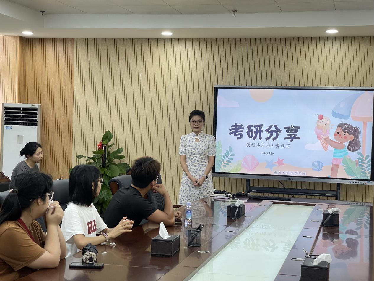 2025年5月20日,外国语学院在大学生创业园501会议室举办2025年考研经验分享会,特邀2025届毕业生优秀学子黄燕菲(广西师范大学研究生拟录取)、黄慧琳(福州大学研究生拟录取)担任主讲人,为学院备考研究生的同学传授经验。