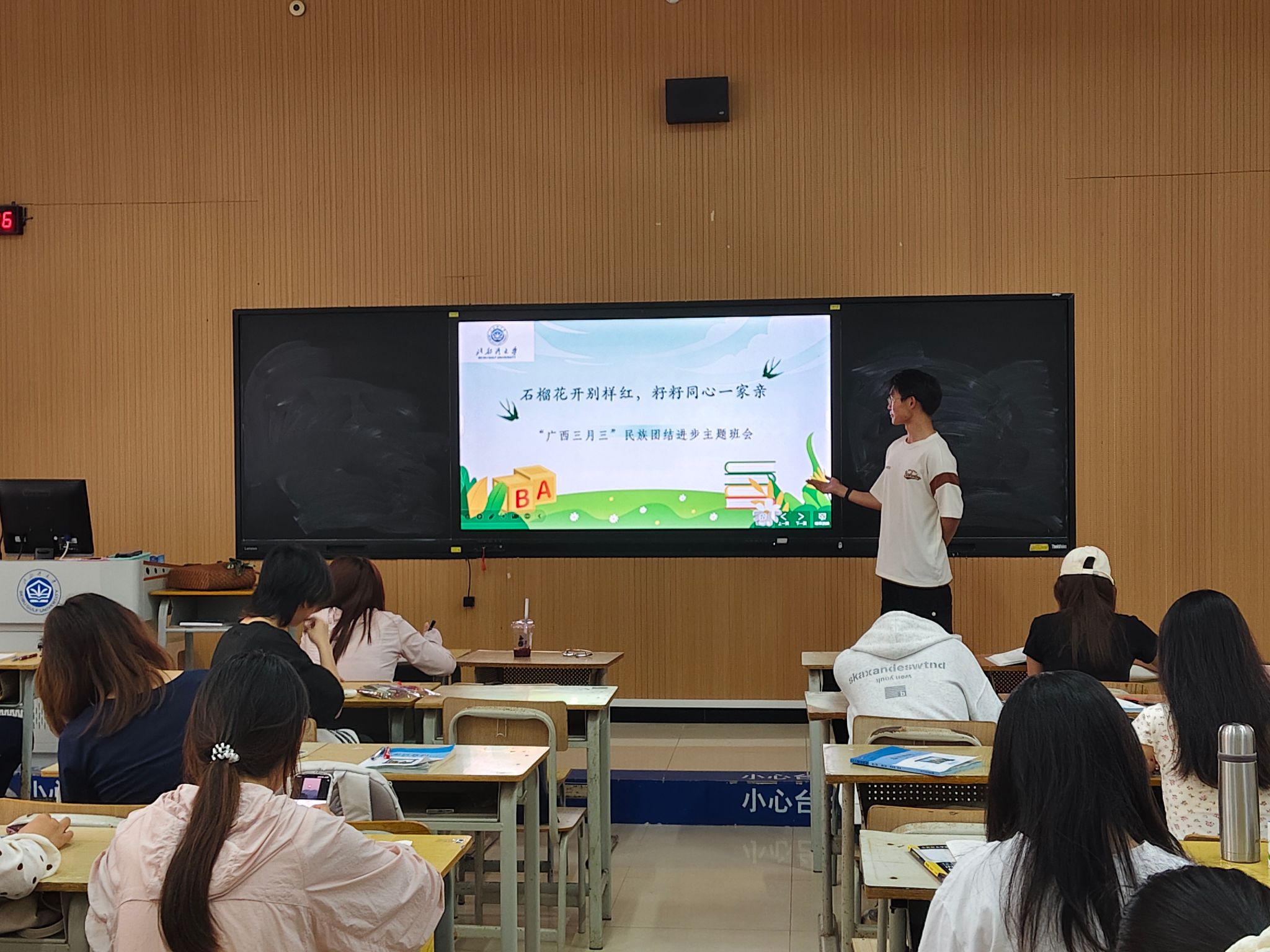 为铸牢中华民族共同体意识,加强民族团结进步教育,学院组织各班开展“石榴花开别样红,籽籽同心一家亲”三月三主题班会。班会主要介绍广西”三月三”节日内涵,包含起源传说、传统习俗等;其次由同学们结合广西文化历史,讲述民族英雄事迹和分享民族团结故事;最后开展讨论交流,分享对民族文化的感受理解。主题班会不仅让学生们深入了解了壮族三月三的深厚历史底蕴和文化内涵,更让他们在实践中感受到了传统文化的魅力和价值,进一步增强了文化自信和民族自豪感。