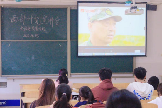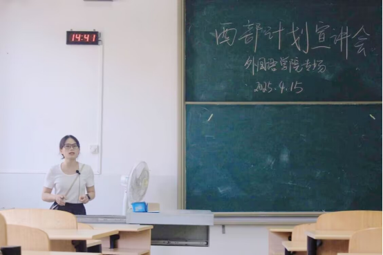 为了鼓励青年学子响应号召,扎根西部基层,助力区域协调发展,2025年4月15日,外国语学院在11-415教室开展了一场西部计划宣讲会。本次活动由周雪洁老师主持,100余名学生参加。