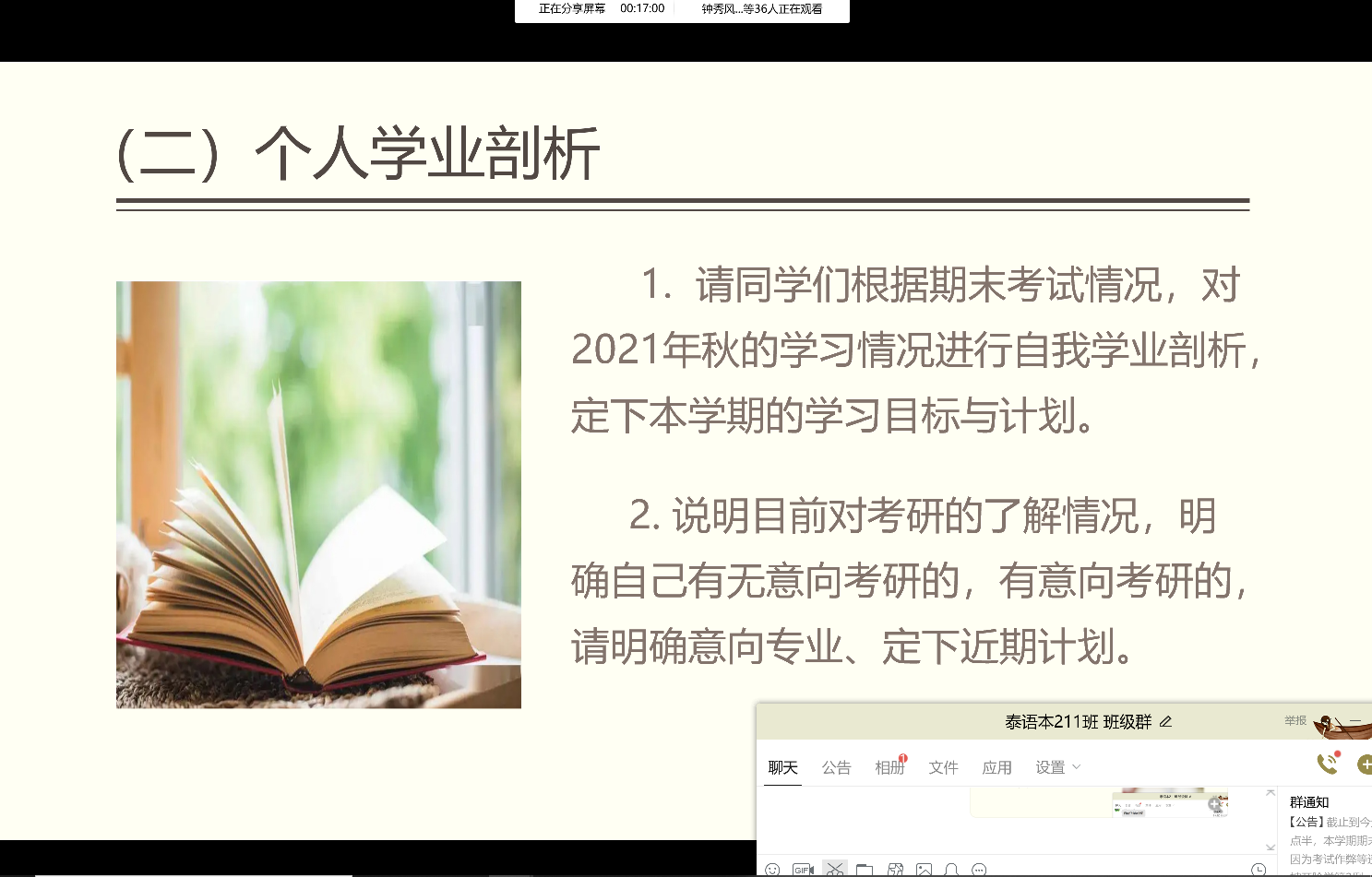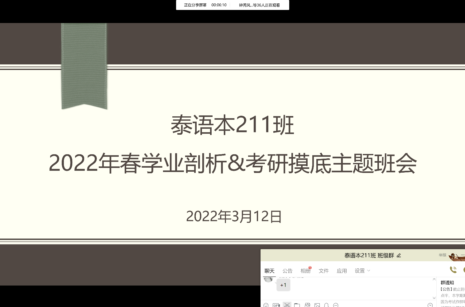 2022年3月12日晚八点,为了帮助同学们更好地学习,并结合上个学期的经验对自己的未来有更加清晰的目标和规划,国际教育与外国语学院泰语本211班在线上举行了学业剖析暨考研摸底主题班会。参加会议的有班主任党雪妮老师和泰语本211班全体同学。