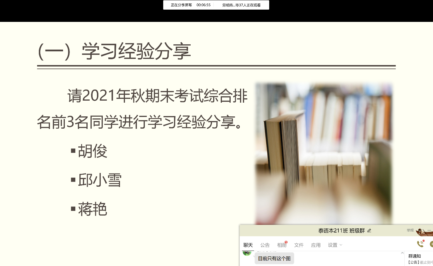 首先,党雪妮老师请2021年秋期末考试综合排名前三名的同学进行学习经验分享。这三位同学结合自己的学习经验向大家分享了许多有效的学习方法,比如:上课一定要认真听讲,一边用笔划出重难点;课堂笔记不要光靠手机拍照,一定要拿笔来写;学前要预习,学过的知识也一定要及时复习,不要拖拉,要跟上老师的进度;遇到难题,要积极向同学和老师寻求帮助,及时解决……三位同学发言完毕后,同学们按照学号轮流对自己的学习情况进行了自我学业剖析并定下本学期的学习目标与计划,同时说明了自己目前的考研意向。大部分学生表示自己上个学期学习不够努力,许多方面还存在很多不足,一些同学表示自己存在上课不专心、温习不及时等情况。最后,党雪妮对大家的发言作出评价,总结了大家遇到的问题,并对同学们普遍存在的难题逐一作出讲解。她表示,同学们应当对自己负责,一定要利用好上课时间,做好课堂笔记,重视泰语和英语的学习,并要求大家制定每周量化学习计划,要自律,不能放任自己进入混日子大军里。