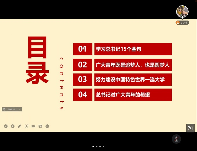 本次主题团日活动主要学习习近平总书记在北京大学师生座谈会重要讲话精神。此次主题团日由党员甘小丰同学为领与同学一起学习习近平总书记在北京大学师生座谈会重要讲话精神。本次同学们的学习主要是从学习总书记15个金句,广大青年既是追梦人也是圆梦人,努力建设中国特色世界一流大学以及总书记对广大青年的希望四个方面进行学习。