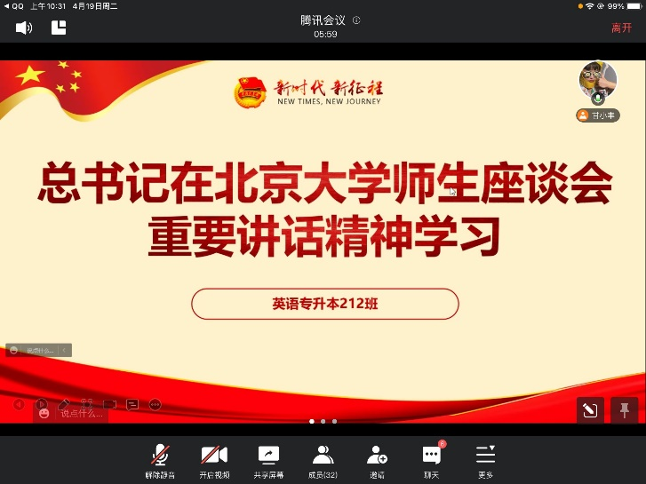 习近平总书记考察北京大学,出席师生座谈会并发表重要讲话。为认真学习领会习近平总书记重要讲话精神2022年4月19日上午,英语专升本212班级以网上会议的形式开展了喜迎二十大的主题团日活动。