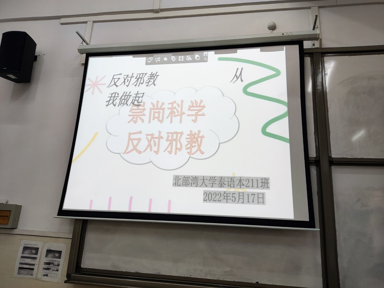 2022年5月17日下午,泰语本211班在国际交流中心109教室举行了“反对邪教,从我做起”主题班会。出席会议的有谢旻老师和第2021届泰语专业全体学生。