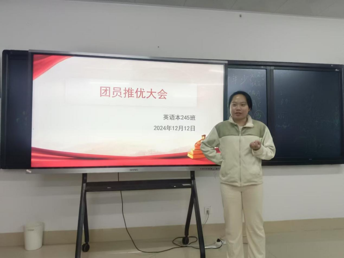2024年12月12日,英语本245班在大创507教室召开入团积极分子推优大会。本次会议由团支书邓王宇翔主持。首先,团支书清点到场团员数,确定人数过半数并介绍符合入团积极分子条件的候选人情况。随后,各位入团积极分子候选人逐一进行演讲,演讲内容包括对团组织的认识、入团动机、思想品德、学习态度及成绩、担任学生干部及参加各类活动情况等。在每位入团积极分子候选人完成演讲后,团员们则逐一进行无记名投票,并由组织委员赖锦萍进行计票。最终公布各位入团积极分子候选人的得票情况,确定推荐入团积极分子人选名单。