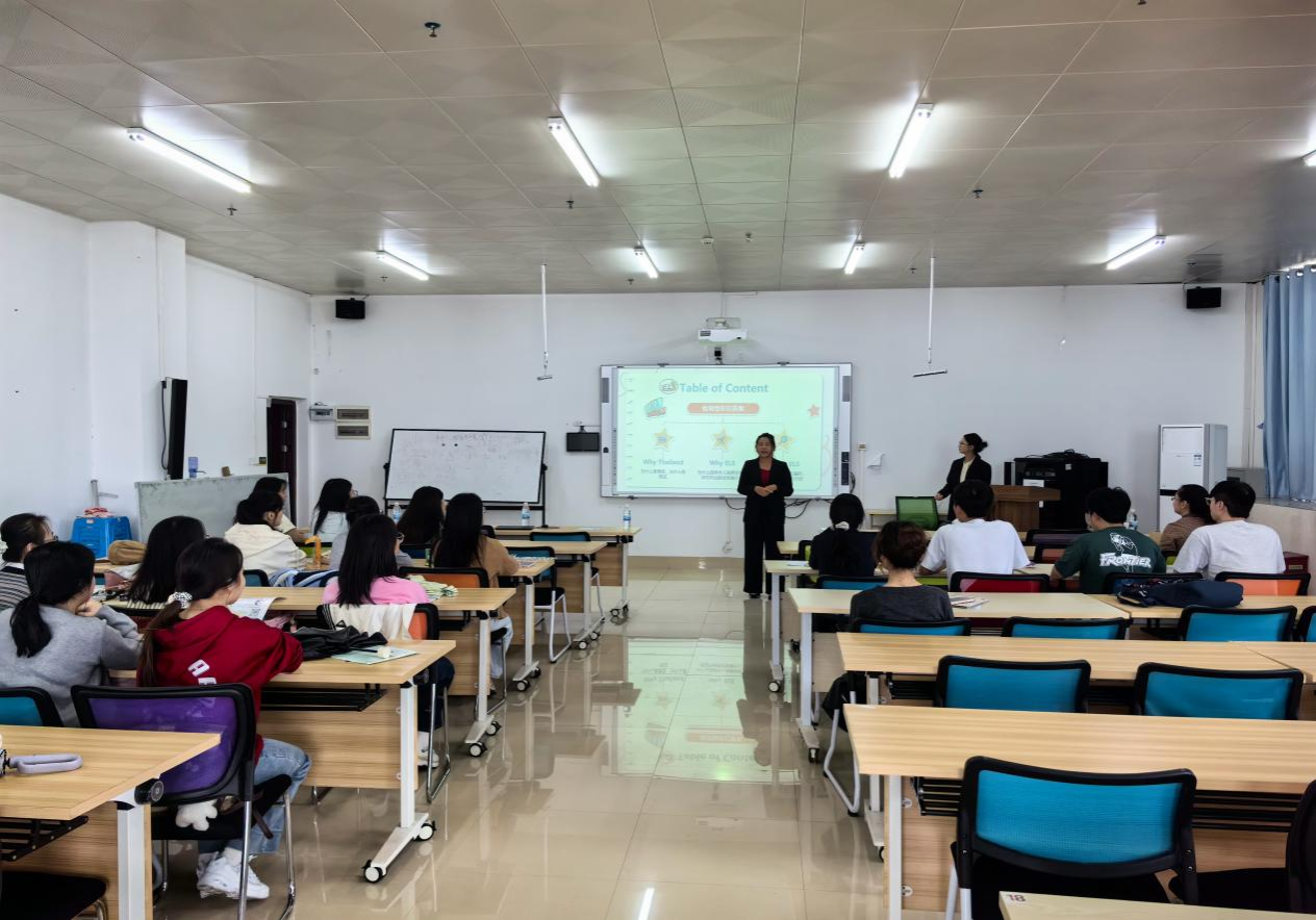 2025年10月31日下午,泰国知名语言学校——华人语言学校受邀走进北部湾大学外国语学院,在学校大学生创新创业中心(大创)410室举办宣讲会,泰语本221班近30名师生到场参与,现场交流氛围浓厚。