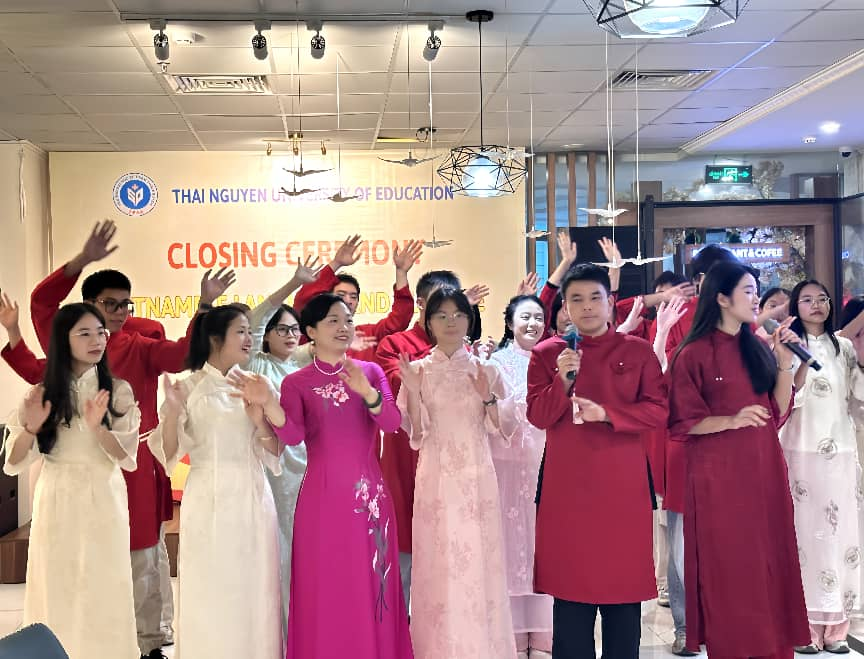1月17日下午,本次冬令营闭幕式在中越学生双语主持下圆满举行。北部湾大学师生合唱所学的越南经典民歌《Bèo Dạt Mây Trôi》(浮萍),师生共同演绎奥黛走秀,赢得了全场阵阵热烈掌声,学生代表陈延豪致谢时表示:“这场研学之旅充满惊喜与收获,让我深入了解了越南的教育特色与文化氛围,结识了许多热情的越南朋友。此次经历不仅开阔了国际视野,更让我深刻体会到跨文化交流的重要意义。”离别之际,中越师生交换纪念礼物,依依不舍,珍重道别。