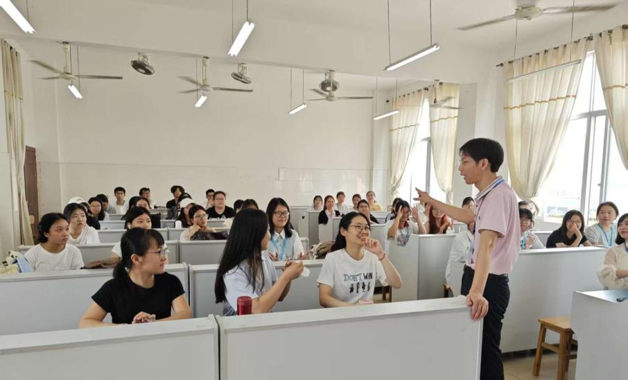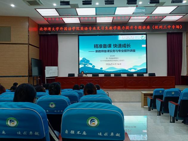 活动前期,各班级班主任及指导老师召开动员大会,明确见习期间的安全规范与核心任务,包括教案设计、无生试讲及课堂记录。见习过程中,学生分组进入对应班级听课,同步记录教学问题与困惑,并及时向指导老师咨询解答。4月9日,各班开展无生试讲成果汇报,并邀请钦州市第三中优秀教师进行专业点评;4月16日,钦州市三中同北部湾大学联合开展了教学提升讲座和公开课学习,并邀请钦州市基础教育名师扬帆工程成员,钦州市第三中学高一年级组备课组长梁凤琴老师进行讲座讲授,分享教学经验并表示对本次北部湾大学英语专业见习生寄予厚望,最后,老师和同学们围绕教学活动设计展开讨论,现场氛围活跃。