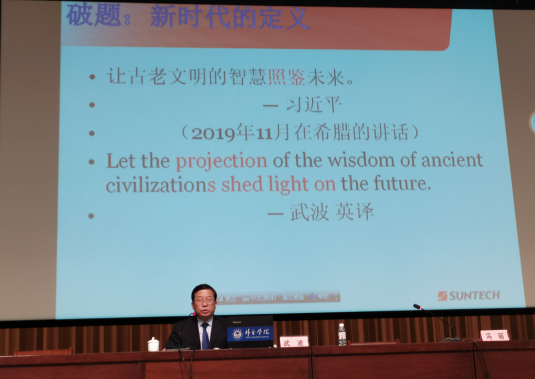 武教授从新时代中华民族伟大复兴的背景开始阐述中国梦是国际梦、文化梦、造福世界的梦,它的原型是中国古代的华胥梦,即天下大同的梦。“国际梦”意味着中华民族此次复兴是伟大的世界事件,它将造福全人类。“文化梦”意味着世界将凭借中国古典文化复兴而进入更加美好的文明秩序。“造福世界的梦”意味着中国的外语教学必须做好充分准备,中国人要用西方的语言(主要是英语)将中国文化的核心思想和理念,传播到世界的其他地方。天下大同是中华民族古老的理想,今天,“人类命运共同体”创想非常接近天下大同的理念进行阐述武教授还结合《新文科建设宣言》和《普通高等学校外国语言文学类专业教学指南》,指出新时代国际化人才的标准,以及外语教学应该如何有针对性地加以改革和调整。