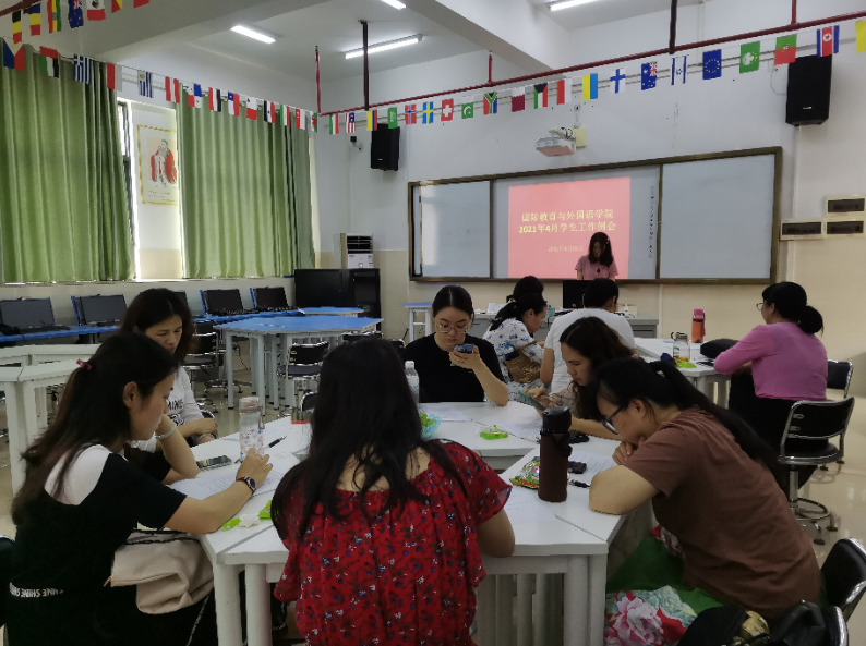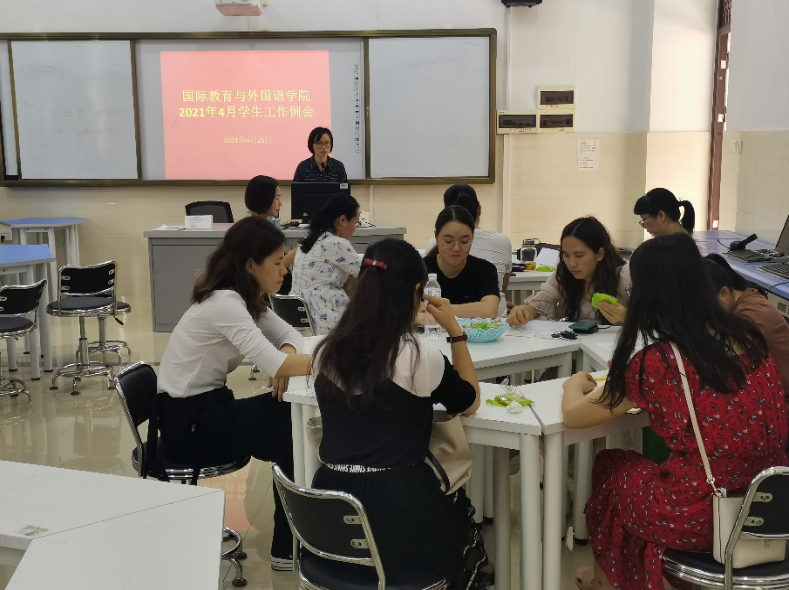 4月25日中午,我院在国际交流中心219召开2021年4月学生工作例会。学院党总支副书记伍红艺及全体班主任、辅导员参加了会议。首先,学工办主任蓝水萍对近期工作及下一阶段工作进行总结和布置:一是高关怀学生谈心谈话发现的问题及下一步工作安排;二是对学院学风建设近况进行了说明,总体来说,学风建设有待加强,并强调了从早读、晚自习、学科竞赛、就业指导等方面促进学风建设;三是对近期宿舍违纪进行了通报,要求各班辅导员加强安全教育;四是宣读了《国际教育与外国语学院2021届毕业生就业工作方案》、《国际教育与外国语学院2021届毕业生就业创业工作暨建档立卡毕业生就业创业工作领导小组》及《国际教育与外国语学院2021届毕业生“一对一”帮扶任务分配表》,明确了由各位班主任、辅导员担任相应学生的就业指导老师;四是对“平安湾大”的请假手续进行了说明,要求辅导员每天至少查看“平安湾大”小程序两次,并按照学校有关规定,严格审批;五是对学院近期学生学习党史活动进行了梳理和布置,建议辅导员将党史学习活动与德育系列主题班会结合起来,提高班会教育效果。