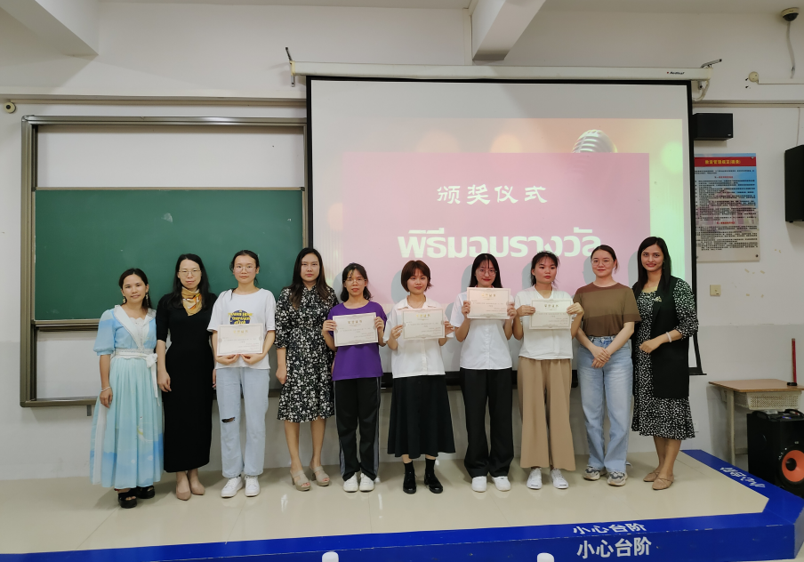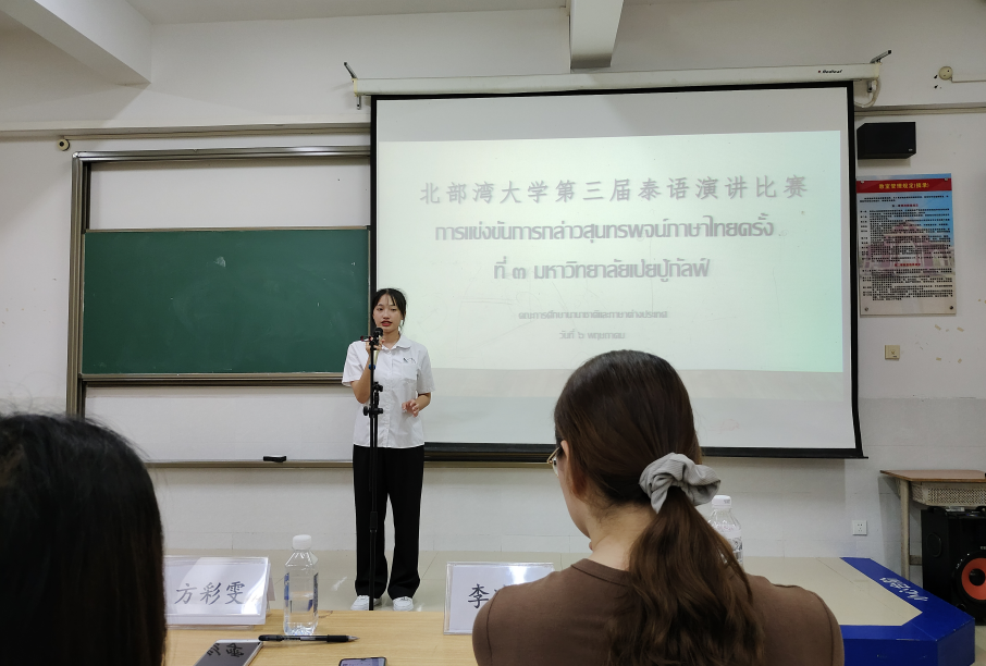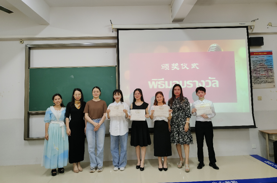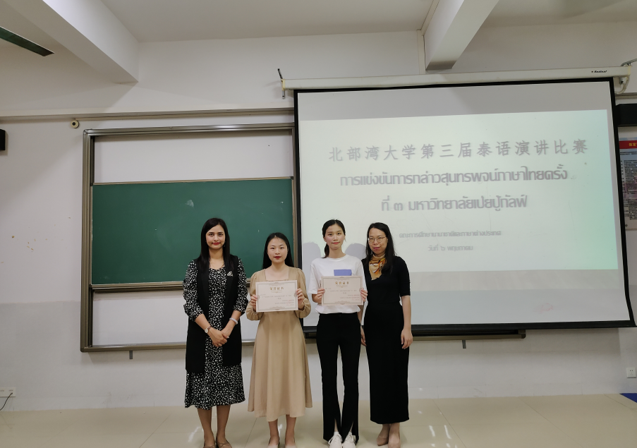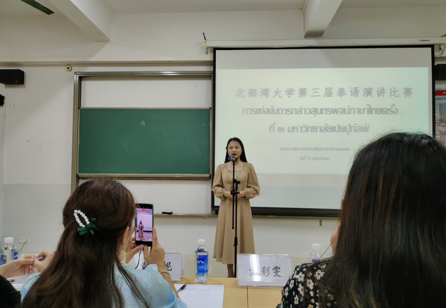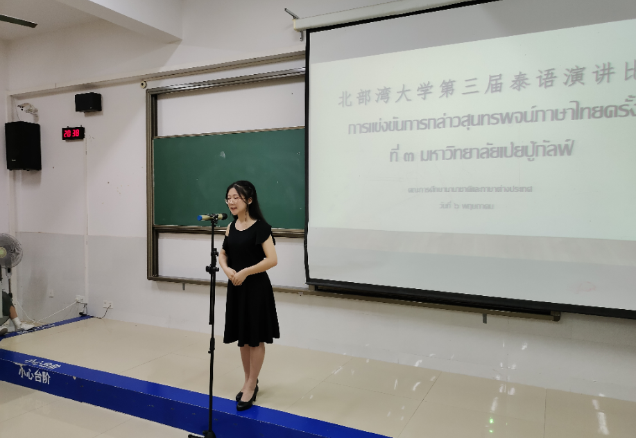 为了提高学生的专业技能水平及口语表达能力,我院泰语专业于2021年5月6日晚上19:30-21:30在12号教学楼504教室举行北部湾大学第三届泰语演讲比赛,此次演讲比赛的题目为“新冠疫情下的中泰关系”。出席此次演讲比赛的评委老师有:党雪妮老师、韦春萍老师、李冰冰老师、泰籍教师方彩雯老师、魏彩萍老师,泰语专业全体学生观看比赛。