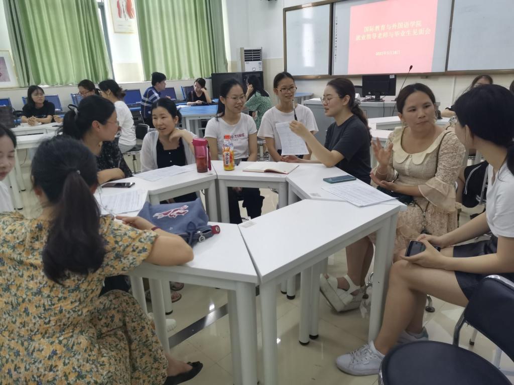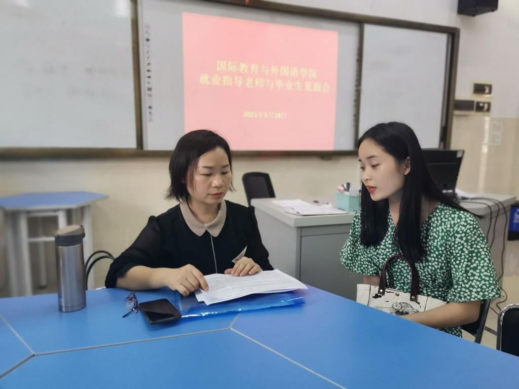 5月18日中午,我院在国际教育与外国语学院219召开就业指导老师与毕业生见面会。学院党总支书记史忠丰、院长冯丽、学院党总支副书记伍红艺、副院长潘景丽及全体辅导员、班主任以及在校毕业生参加。 会上,我院学工办主任蓝水萍通报了截止5月中旬我院的就业情况,对学院的就业工作目标进行了说明。接着,就业指导老师与所指导的毕业生进行面对面交谈、指导,就业指导老师耐心询问毕业生的就业意向、面临的困难以及需要的帮助。毕业生对老师的耐心指导表示感谢,并决心认真准备求职面试,尽快找到满意的就业单位。