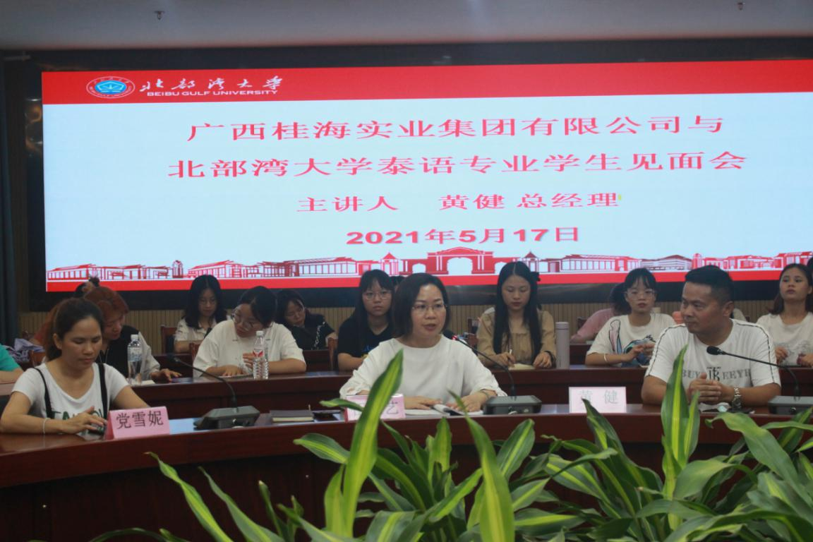 为让我院泰语专业进一步了解专业人才培养方向,了解用人单位的要求,2021年5月17日下午,我院在国际教育与外国语学院222会议室组织召开了校企合作洽谈会。出席本次会议的有桂海事业集团黄健总经理、吴思憧经理,国际教育与外国语学院院长冯丽、国际教育与外国语学院党总支副书记伍红艺、学工办主任蓝水萍、非通用语教研室主任党雪妮等领导老师以及泰语专业全体学生100余人。会议由伍红艺副书记主持。