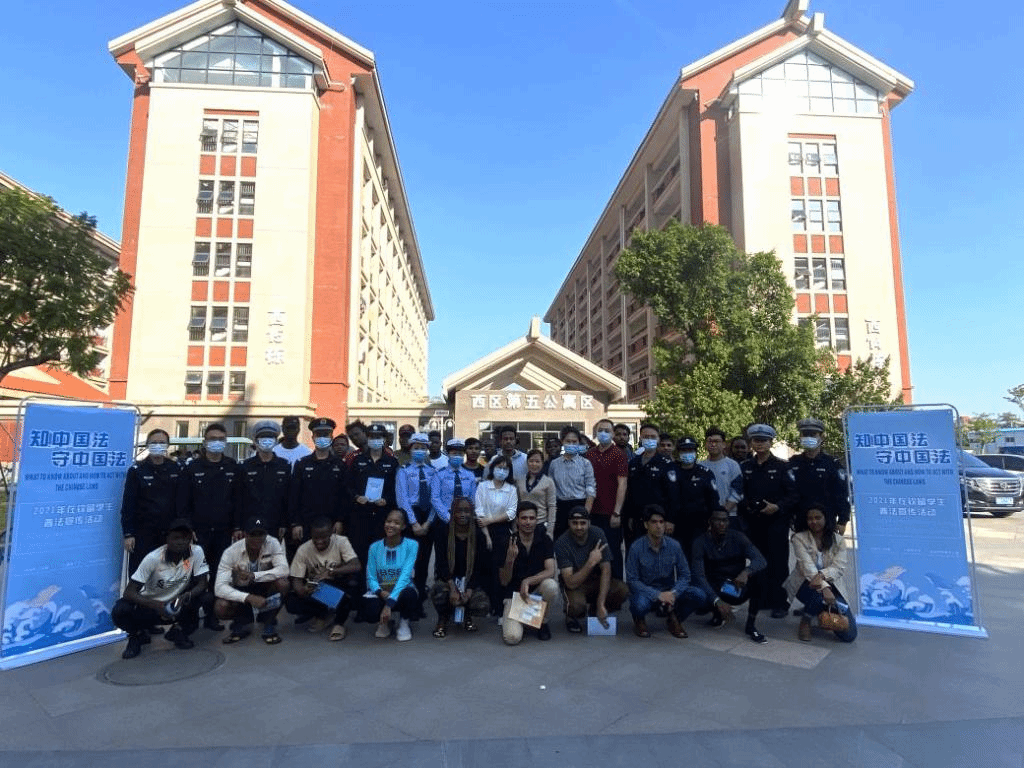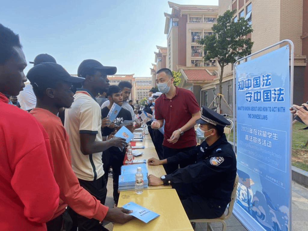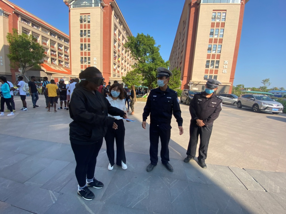 为加强我校留学生的法律法规意识,做好留学生管理工作,2021年10月25日下午,我校与钦州市外事办、市公安局出入境管理支队、市公安局交警支队、禁毒办、防艾办、市团委在我校留学生宿舍区开展普法宣传活动。