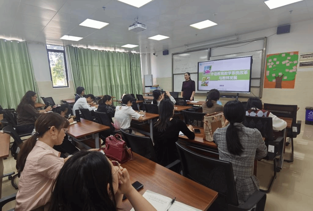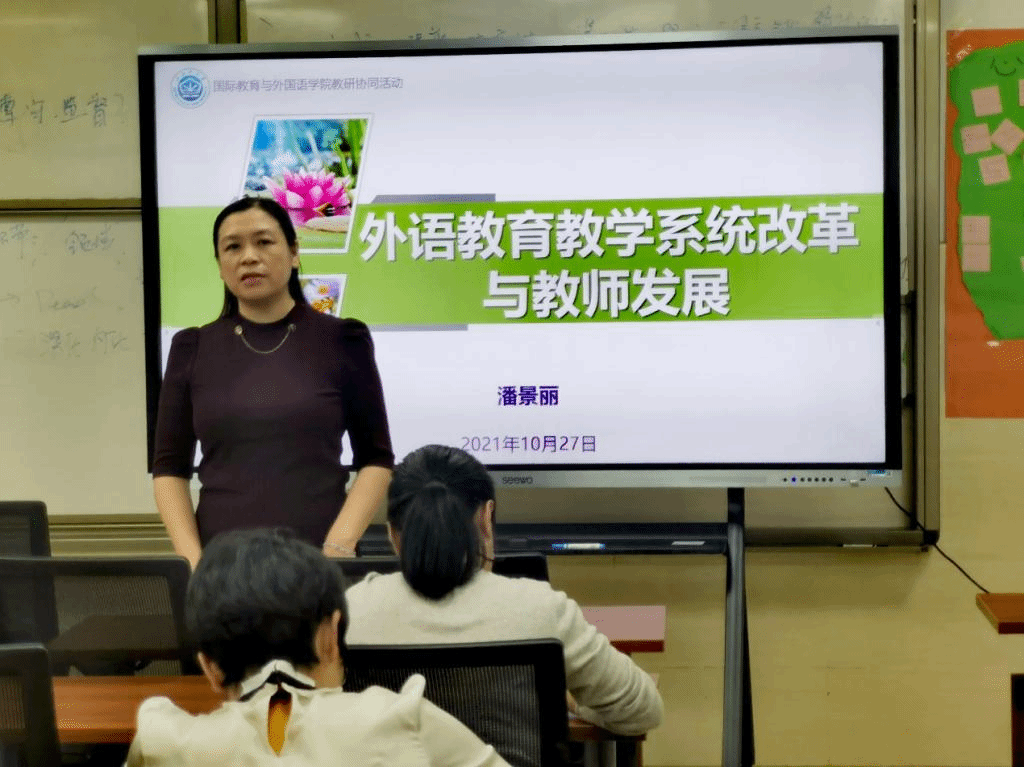 为了更好地教研结合,27日下午,潘景丽教授以“课程思政”公开课为基点,做了题为“外语教育教学系统改革与教师发展”的学术报告。潘教授在报告中阐述了我院外语教育教学系统改革的设想,提出了成果导向,紧扣人才培养目标,以课程建设为抓手,从师资队伍、教学模式、教学手段、教材、学科竞赛等方面系统构建育人体系,形成系统育人成果的理念。潘教授结合教师成长案例,阐述如何立足教师本职工作,紧跟国家教育政策、区域发展需求,善用课堂阵地,从课程建设为抓手,建设在线精品课程、一流课程、“课程思政”示范课程,创新教学模式,申报教研项目,加强教材建设,参与教学竞赛,凝练教学成果等,倡导教师要系统、全面地发展。潘教授还就教师们的教学改革和研究方向提出了建议。