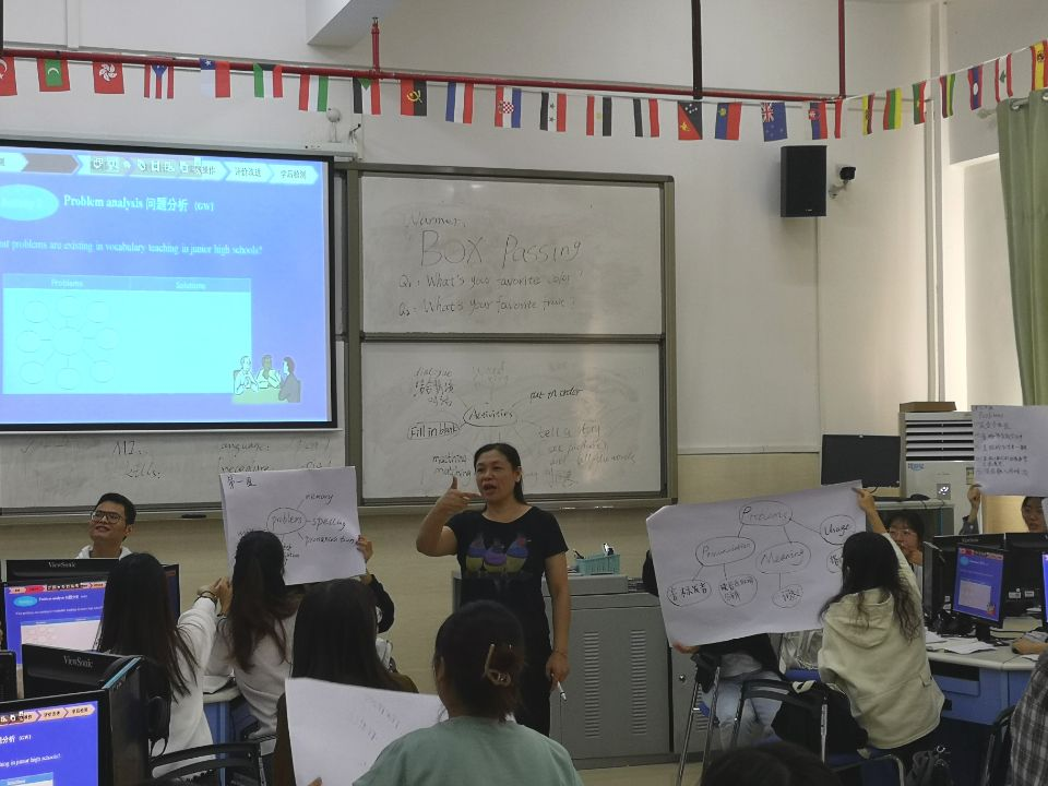 上午三四节,潘景丽教授所主讲的校级“课程思政”示范课立项建设课程《英语教学论》开展了公开课。潘景丽教授注重教书育人,深挖课程德育元素,课堂以学生为中心,在教学过程、教学内容、教学方法、教学活动等方面紧扣人才培养目标和课程目标,结合小组合作、师生互动、生生互动、人机互动等培养学生的从教信念、工匠精神、解决问题的综合能力和团结协作等,做到了课程思政与专业教育的有效融合,将课程思政教育落实到了实处。整个教学过程学生参与度高,课堂气氛活跃,学生乐学,教学实践能力得到提升。我院冯丽院长、伍红艺副书记及我院教师参加了听课活动。