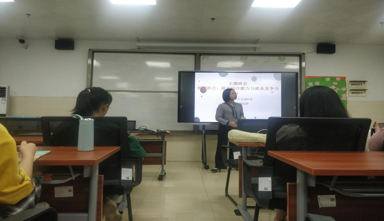 为了增强学生的就业意识,提高学生的就业竞争力,我院英语专升本201班于2021年10月29日下午在国际交流中心108教室召开了“把握机会提高综合能力与就业竞争能力”主题班会。本次班会由班主任伍红艺老师主讲,英语专升本201全体成员参加。