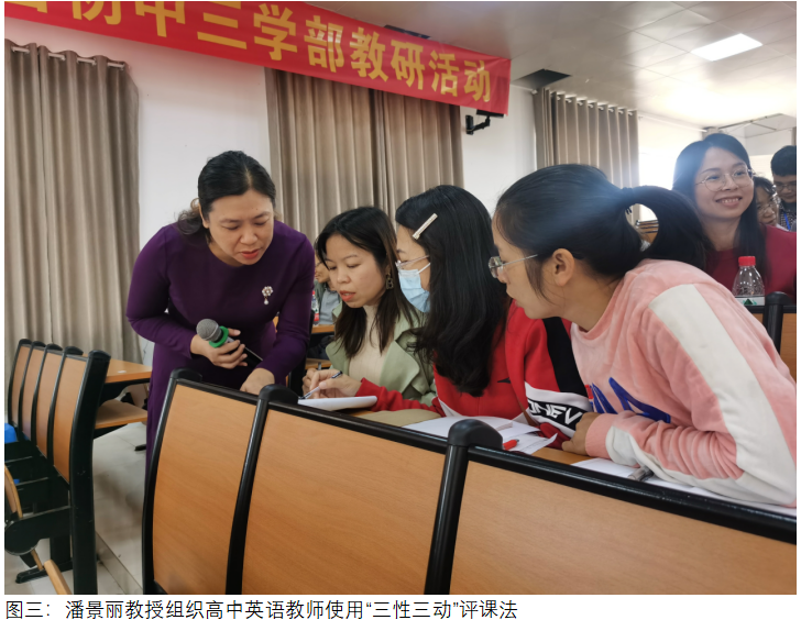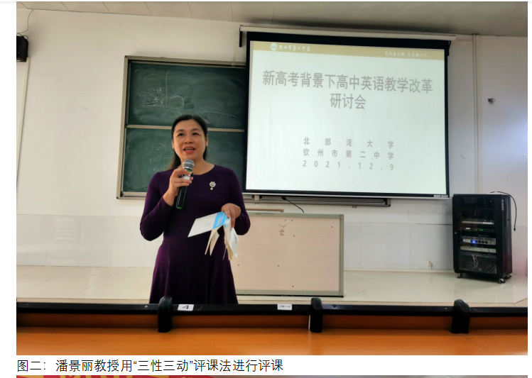 研讨会包括“公开课观摩和评课、新教材教学情况阶段性总结汇报、新高考背景下高中英语教学改革课题研究探讨”等系列活动。首先,钦州市第二中学高二的任课教师林雨农进行了公开课展示,高中老师们、黄伟老师和潘景丽教授先后评课。潘教授在评课过程中讲与做相结合,介绍了“三性三动”评课法并现场组织高中英语教师们上了一节评课的微课,参与教研活动的老师进行了现场讨论和实操,取得了良好的效果。评课活动结束后,高一备课组长陈良春老师对高一新教材的教学情况进行了阶段性的总结,让与会教师对高中新教材和新高考有了进一步的认识。随后,潘教授针对新高考“新课标、新教材、新题型”等要求,就高中英语教学改革可开展的教学改革课题研究主题和范畴发表了意见,与高中英语教师们就新高考背景下高中英语教学改革思路和措施等方面做了初步的探讨。