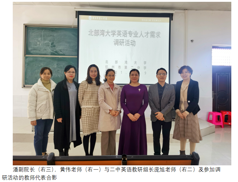 为了进一步了解英语本科人才需求和我院英语本科人才培养质量,12月9日,我院副院长潘景丽教授、英语专业教研室主任黄伟赴钦州市第二中学开展人才需求和人才培养质量调研活动。钦州市二中李远国副校长、高中英语教研组庞旭组长以及高一至高三各年级英语备课组组长参加了调研活动。
