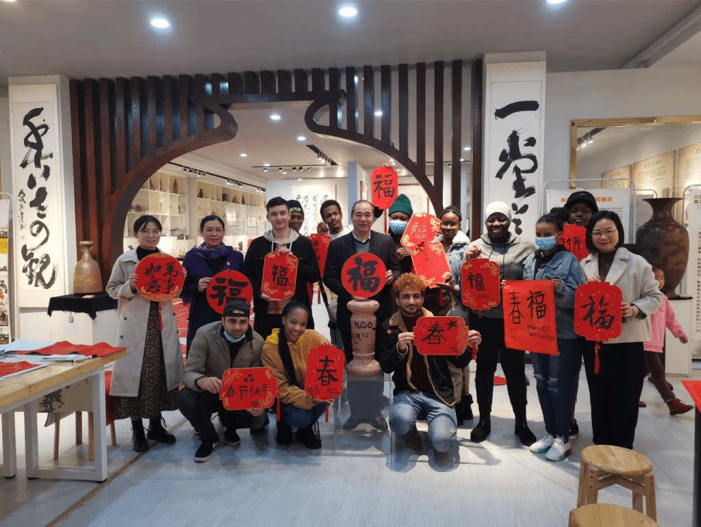 2022年1月21日上午,我校留学生到3号教学楼参加由学校留学人员联谊会与陶瓷与设计学院联合主办的“办实事—迎新春写春联送福字”活动。学校党委常务、副校长唐高华到活动现场指导留学生书写春联。