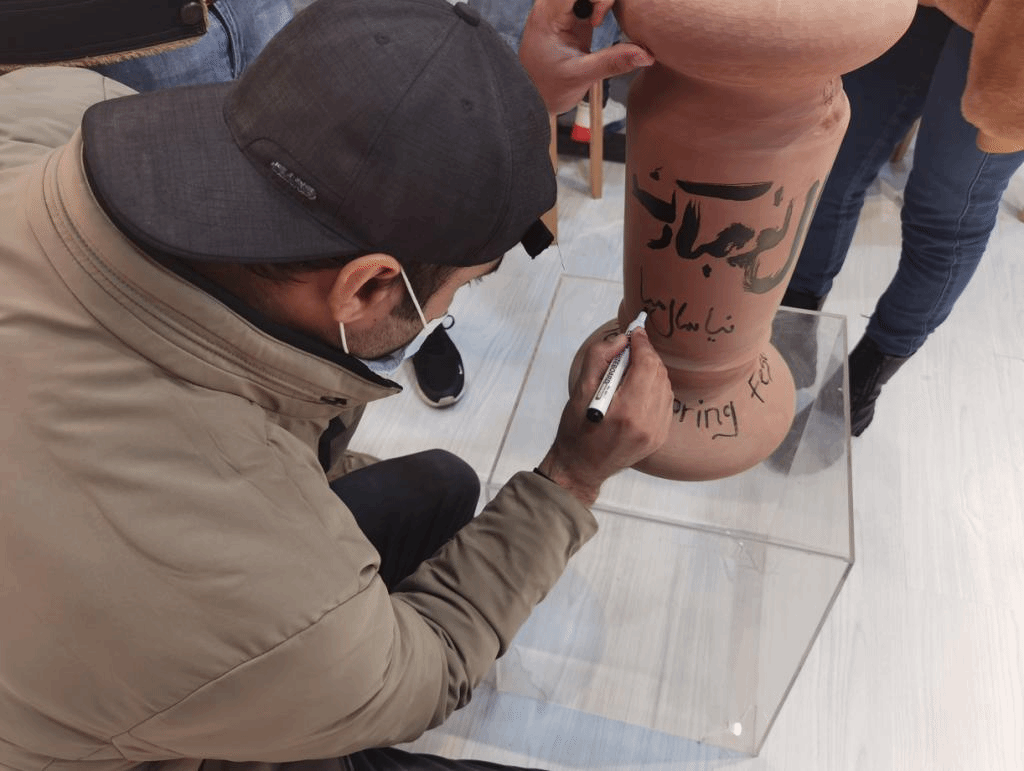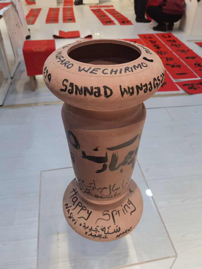 活动伊始,唐高华副校长亲切地为留学生演示如何执笔,教授大家书写“春”字和“福”字。同学们认真聆听,随后迫不及待开始跃跃欲试,用中文和母语字体写下一个个新春祝福。陶瓷与设计学院还为留学生提供一个陶瓷坯胎,由唐高华副校长先提笔写下“春”后,邀请留学生们用母语字体写下自己在新年的美好祈愿。