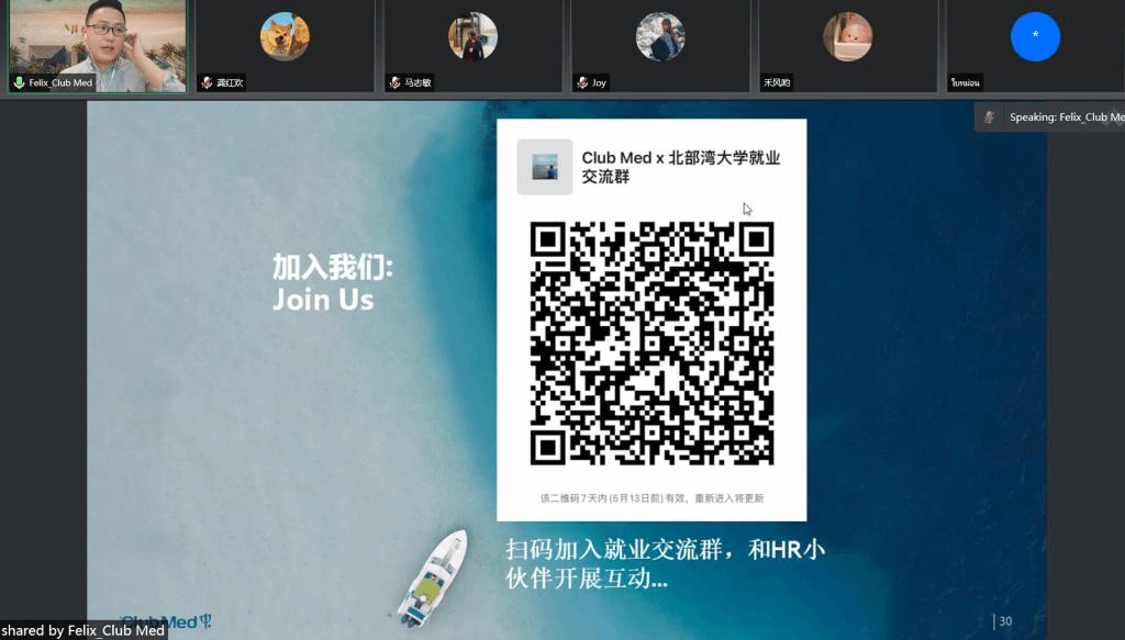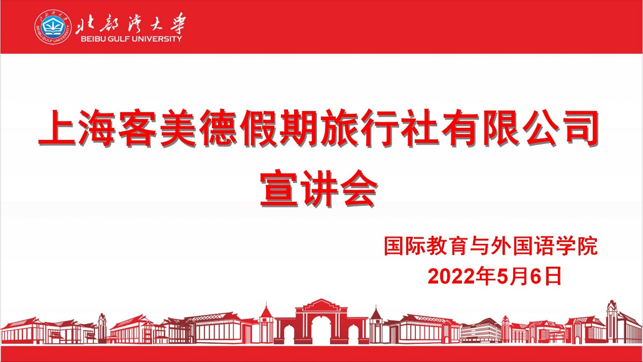 2022年5月6日上海客美德假期旅行社有限公司在腾讯会议召开线上宣讲会,国际教育与外国语学院毕业生及非毕业生生均课参与此次线上会议,会议由国际教育与外国语学院辅导员蓝水萍老师主持。