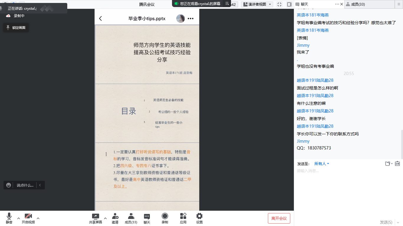 首先,来自英语本171班的李健佳给同学们做了题为《西部计划志愿者之旅》的报告,给同学们介绍和分享了西部计划的相关政策,以及她在这份工作的心得体会;接着,英语本171(专升本191)李坤凤同学和同学们分享了谈谈疫情后就业心态调整的相关内容,她结合自己的亲身经历给同学们一些关于就业以及心态调整方面的建议;其后是英语本181梁家珉同学《浅谈如何快速拿到心仪的Offer》,他在分享过程中给同学们分享了许多有用的建议和技巧;最后是英语本171的 庞圣梅给同学们带来的《师范方向学生的英语技能提高及公招考试技巧经验分享》,她给同学们带来许多在英语教学及工作中的技巧。同学们在参与交流会的过程中和学长学姐们积极交流互动,收获颇多。