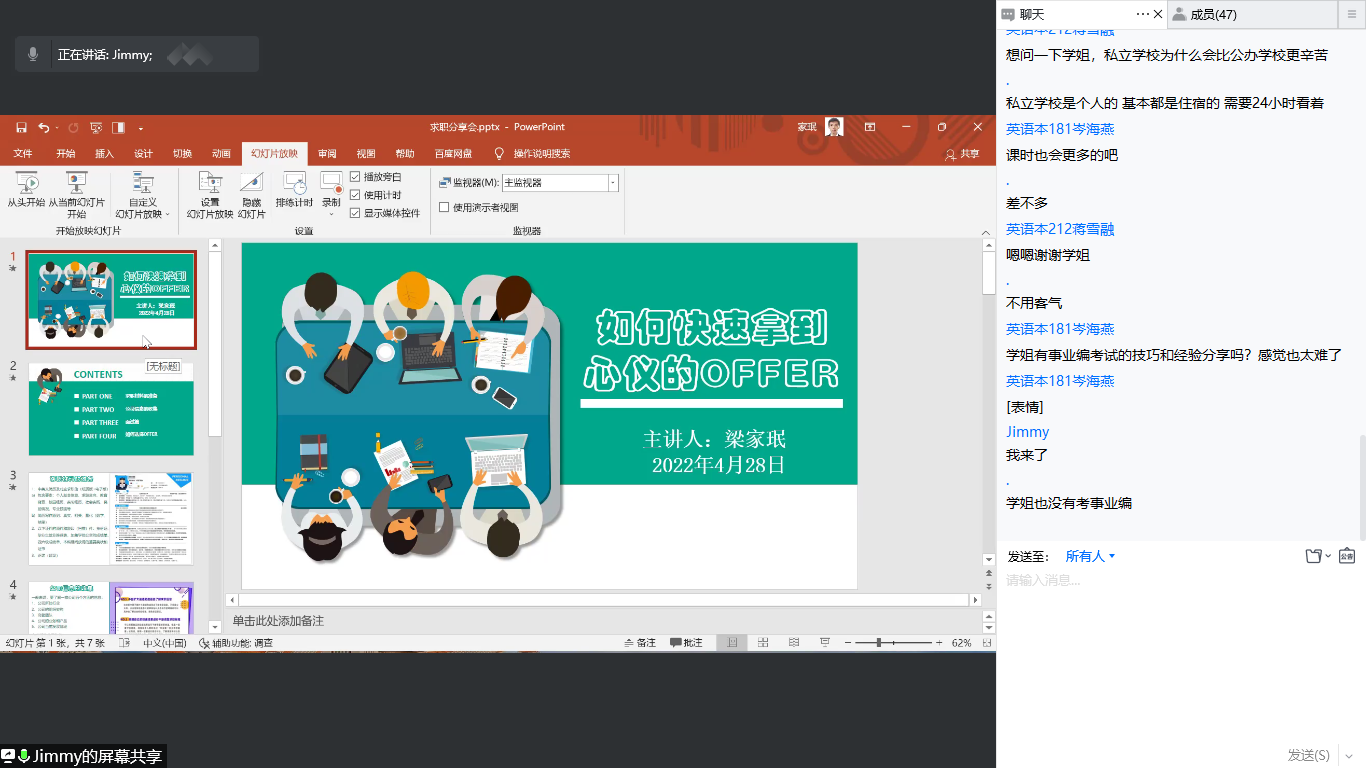 4月28日晚,我院于腾讯会议平台上开展了求职经验交流会,会议邀请了4位在就业方面有代表性的学长学姐们,分享自己在求职过程中的心得体会和宝贵经验,各班毕业生和部分其他年级的同学参加了此次会议。