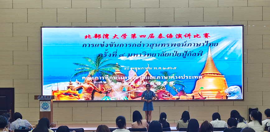 为更好地搭建泰语学习交流平台,增强泰语专业学生的口头表达能力,国际教育与外国语学院于2022年5月10日晚在众创空间301路演厅举办了北部湾大学第四届泰语演讲比赛,参与本次比赛的人员有评委老师党雪妮、韦春萍、劳明燕、魏彩萍,各位参赛选手及各班学生代表。