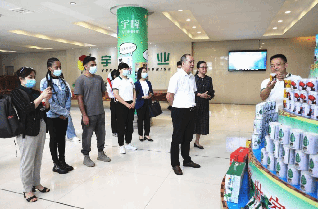 唐高华副校长(右二)一行听取灵山县宇峰保健食品有限公司相关负责人介绍产品