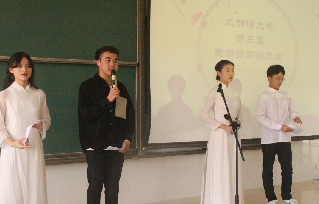 为了提高同学们的越南语表达水平以及综合运用能力,进一步激发同学们对越南语的学习兴趣并营造出浓厚的学习氛围,我院于2022年5月21日在12栋教学楼504教室举行了北部湾大学第三届越南语朗读比赛。参与本次比赛的人员有评委老师颜彦、潘桂艳、杜文楠、阮维东、谢旻,各位参赛选手及越南语专业的全体学生。