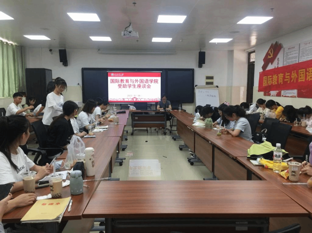 国家助学金是贫困学生求学之路的一个重要保障,为进一步了解受助学生的学习生活情况,培养他们的感恩情怀,2022年5月30日下午,我院在国际教育与外国语学院217教室举办2022年受助学生座谈会。出席会议的有团委书记蓝水萍老师和各班级受资助学生代表。